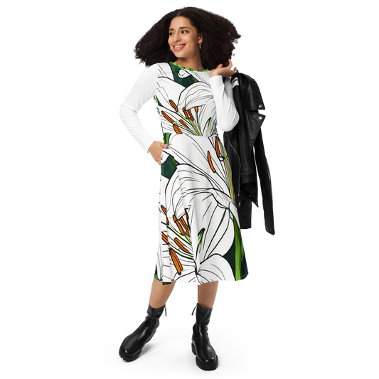 All-over print long sleeve midi dress_White Lily